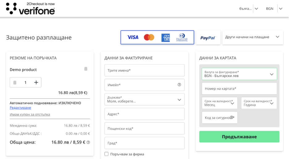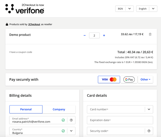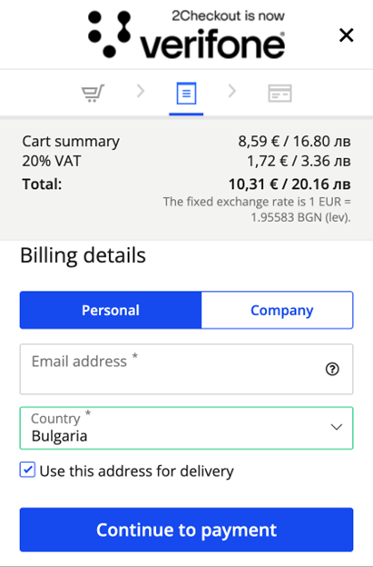 In the 2Checkout ordering system, prices in BGN for Bulgarian shoppers are displayed in both Lev and Euro until December 31st, 2026.