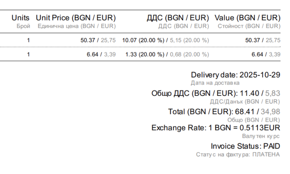 To comply with Bulgarian legislation, all shopper invoices include dual prices (EUR/BGN). This applies to all prices displayed on the invoice, including the discount area.