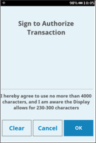 If merchant is configured for enable signature capture and the transactional signature dollar threshold is exceeded, the Signature screen will display. Sign in the signature area and tap OK button. Tap the Clear button on form or physical keypad while a signature is present will clear the signature so that it can be re-written by the cardholder. |